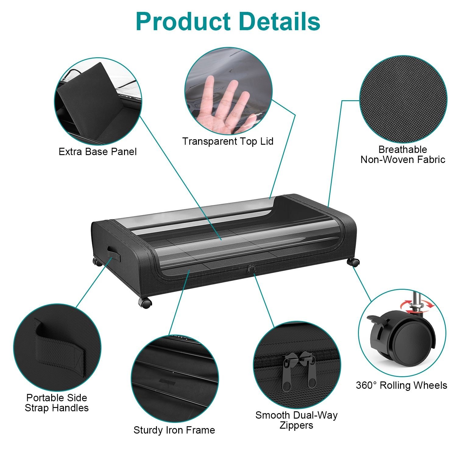 *360° Lockable Rolling Wheels*:Equipped with 4 360° smooth wheels and 2 side strap handles,which allow the under bed containers to effortlessly quickly gliding in and out underneath bed when in use. With lock function on 2 wheels,simply make the storage bin stay still when place under the bed. Just press the locking mechanism lightly to lock and pull it up to unlock.