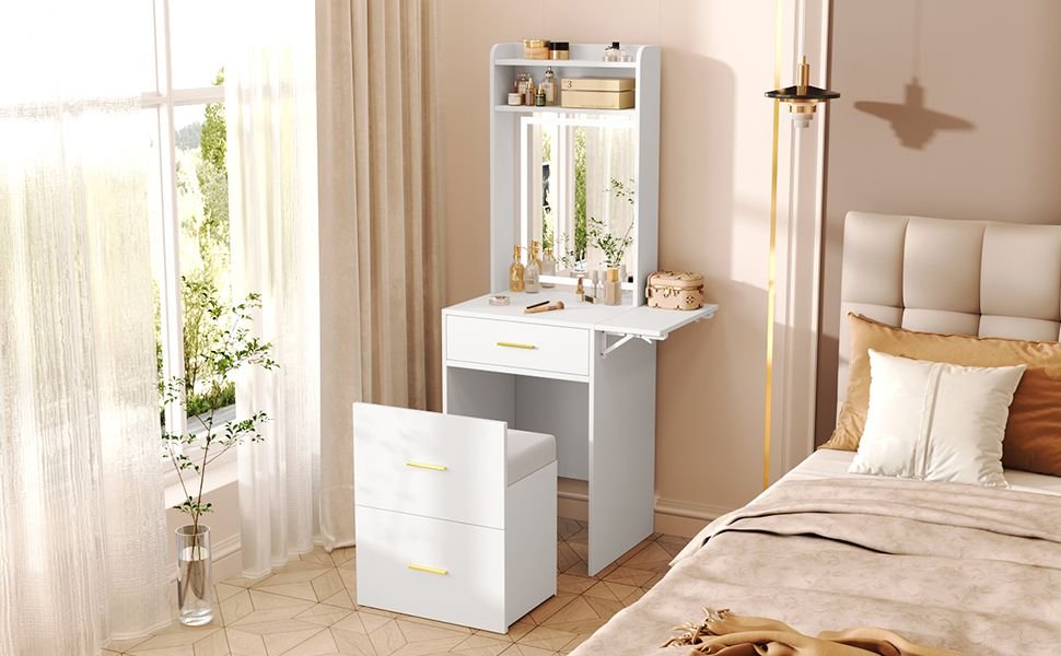 2.Small but Spacious: Despite its small footprint, this vanity offers ample storage with a large drawer and a roomy top featuring shelves above. The foldable side panel adds extra convenience, ensuring all your essentials are within easy reach.