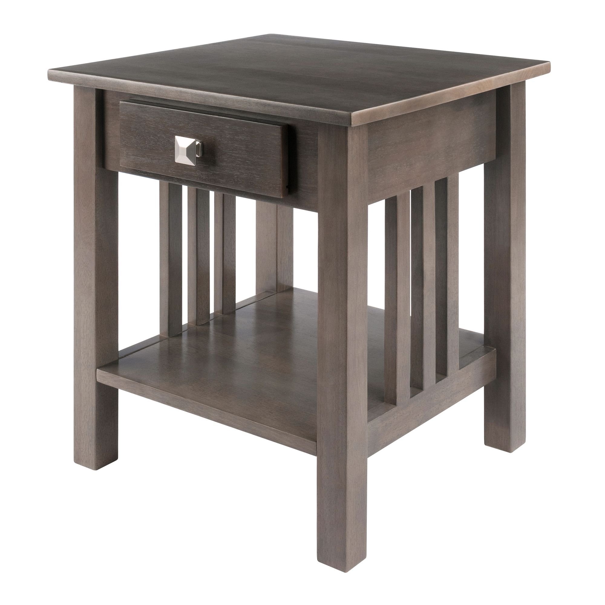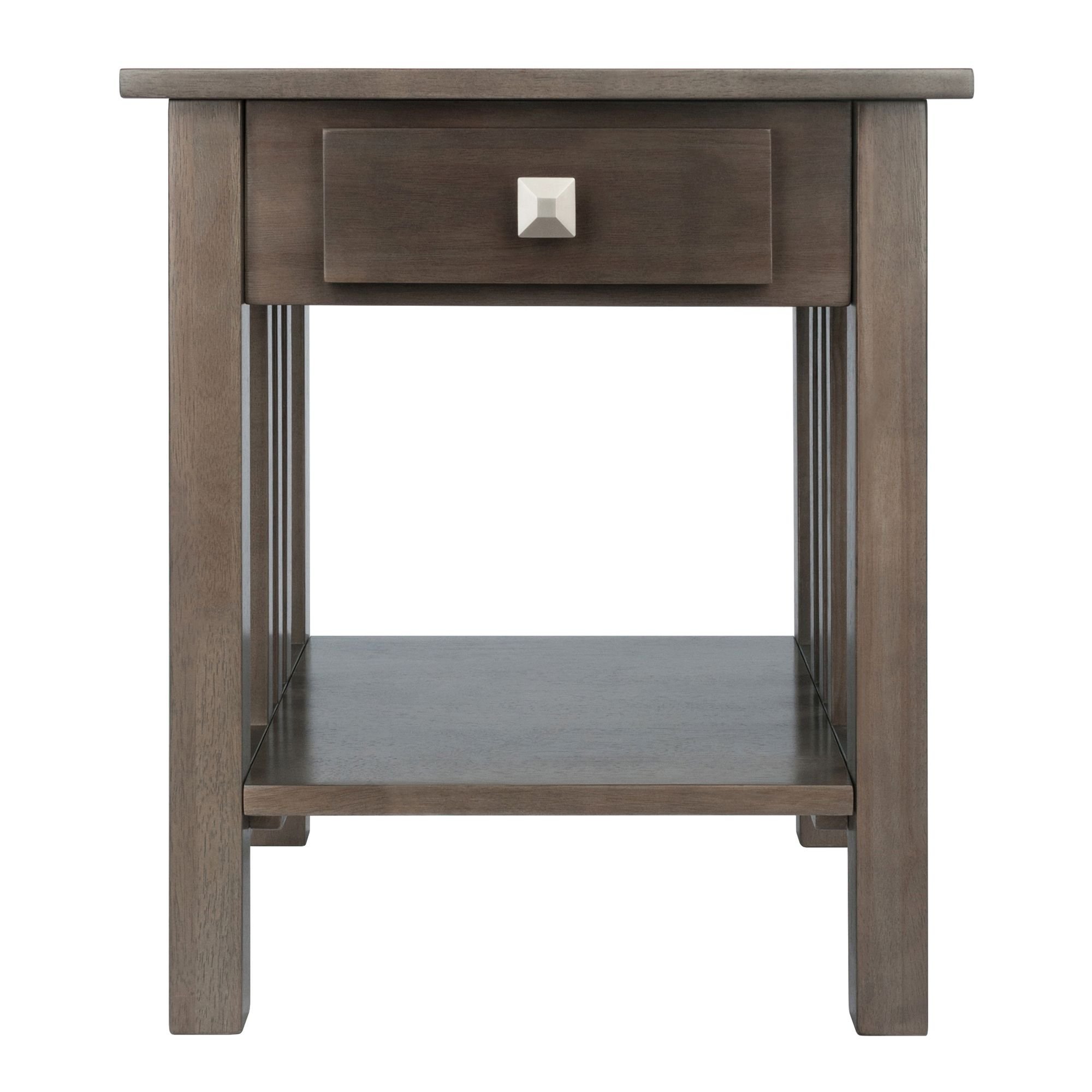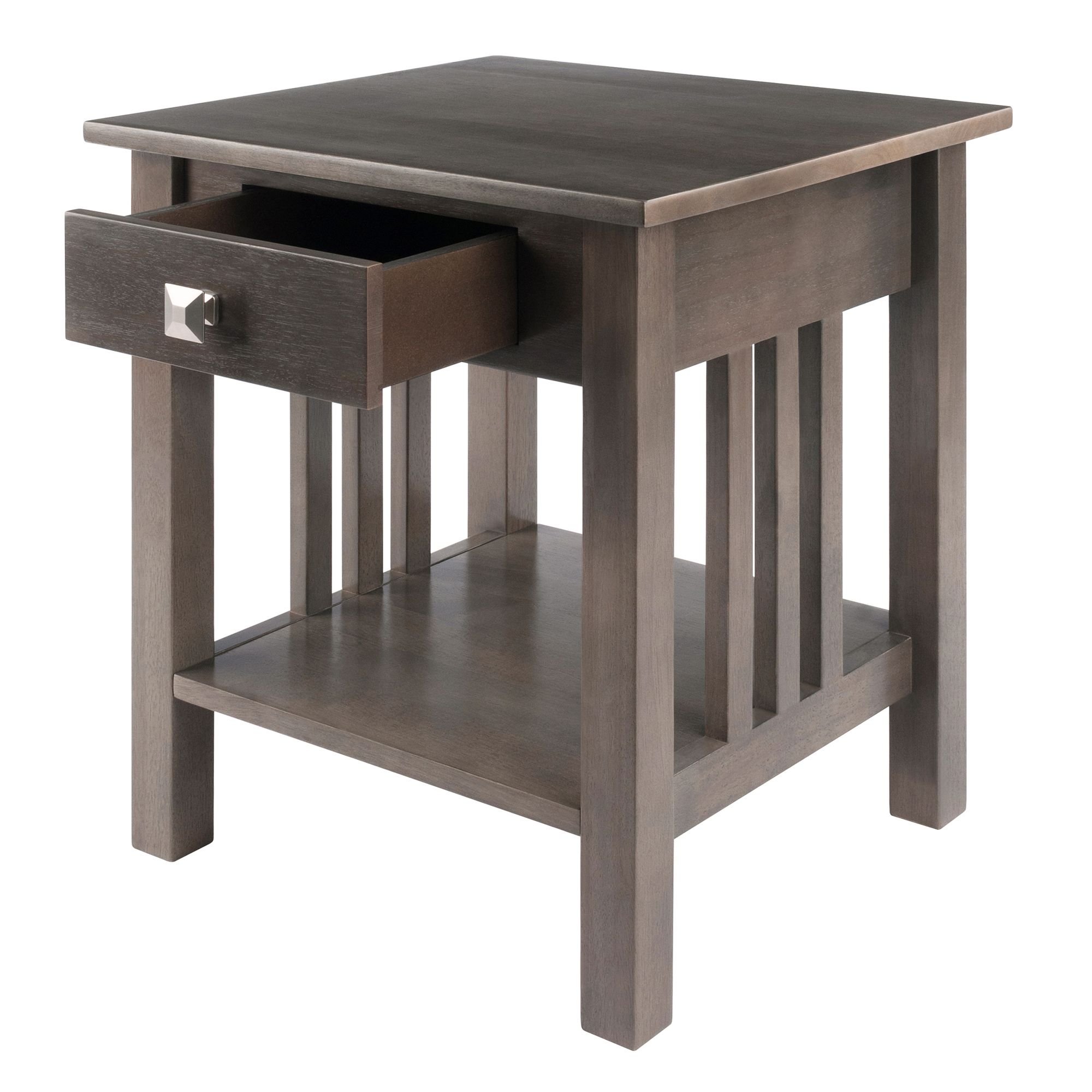 A handsome blend of classic and contemporary styling enables the Winsome Wood Stafford End Table to complement any decor. The mission-like slatted side panels create an open feel while the oyster gray finish gives it a modern touch. Featuring one drawer making this accent table just right by your bedside for a reading lamp; storing small personal accessories out of sight; yet within easy reach for your convenience. The drawer is tastefully accented with a beveled silver-finish pull. An open lower shelf is ideal for keeping books and magazines. Use this all-around end table in the living room next to the sofa or a printer stand in your home office. For larger beds; sofas or rooms; try adding one accent table on each end and coordinate with other furnishings from the Winsome Stafford collection for a cohesive look throughout your home (each sold separately). Solid and composite wood construction for long-lasting beauty and durability. Conveniently packed and shipped in 1 box that includes the hardware necessary for assembling. Replacement part request can be submitted directly to the manufacturer within 60 days from date of purchase.