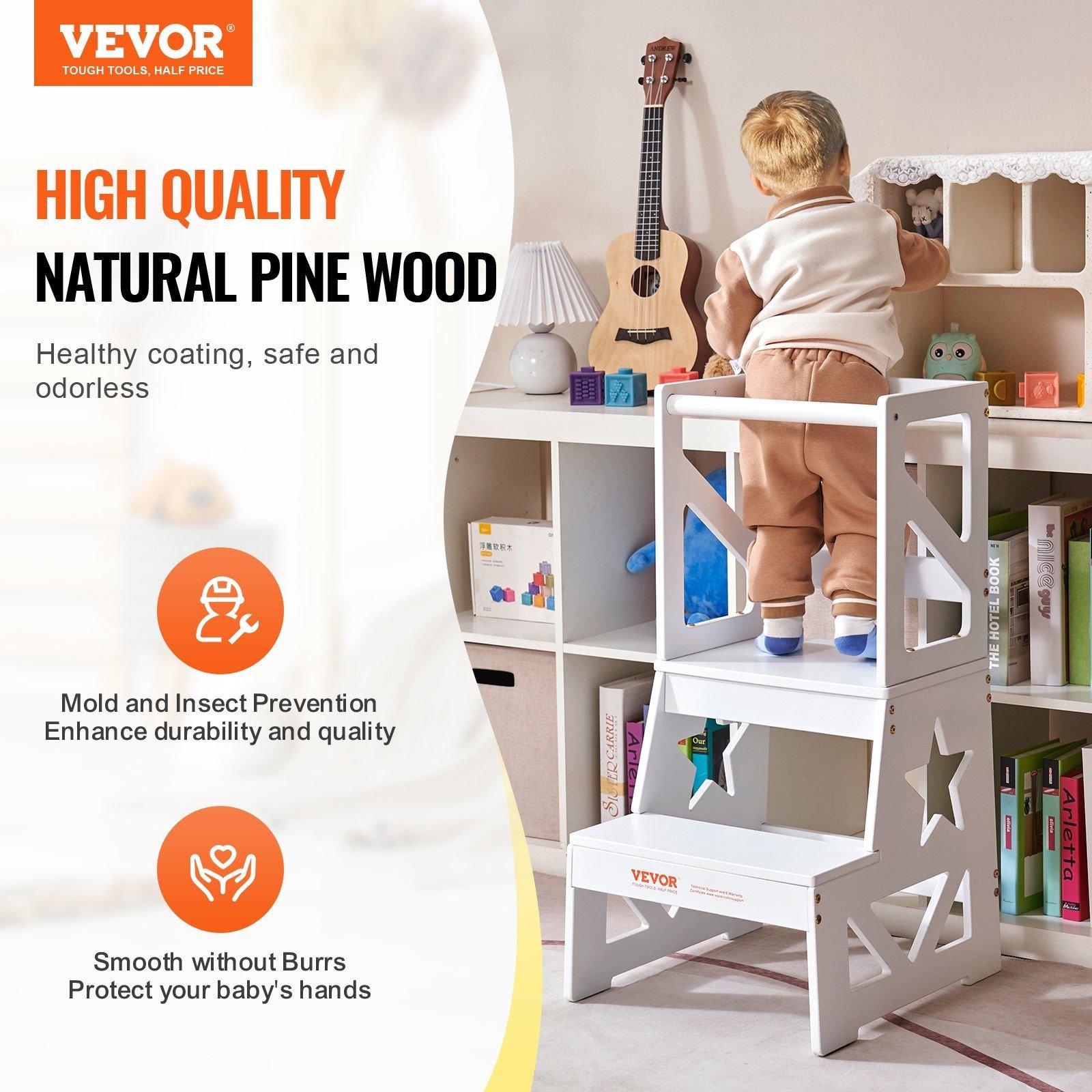 Safeguard every moment of growth, the perfect companion for children's exploration! VEVOR natural pine wood toddler step stool is the gateway to fostering kids' independence, exploration and growth. Let your little one explore, cook, and reach new heights: 150lbs loading and stable "A" frame.