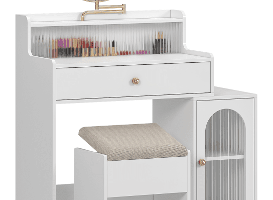 [Ample Storage Solutions]The white vanity offers two drawers—a visible top drawer and a hidden bench storage—plus additional concealed space under the mirror, perfect for organizing cosmetics, skincare products, and more.